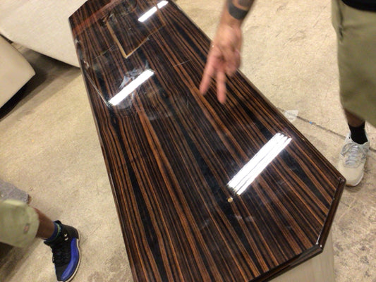 AS-IS Brown Lacquered Top Sliding Door Buffet(Holes In Top/Scratches In Top)