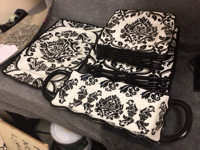 222 Fifth Muse Black Scrolls & Flowers 14 PC Hors D'oeuvre Set