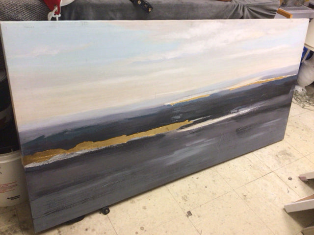 28 1/8" X 58 1/8" Blue/Gold/Beige Abstract Print On Canvas