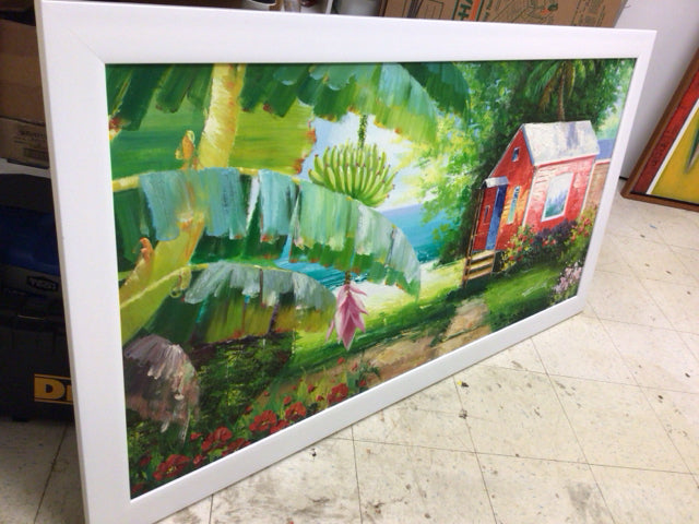 65 1/4" X 35 1/8" White Framed Beach House Oil Painting On Canvas