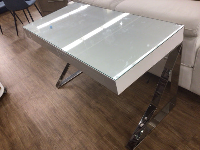 AS-IS White Lacqured Two Drawer Glass Top Desk W/Chrome Base(Chips)