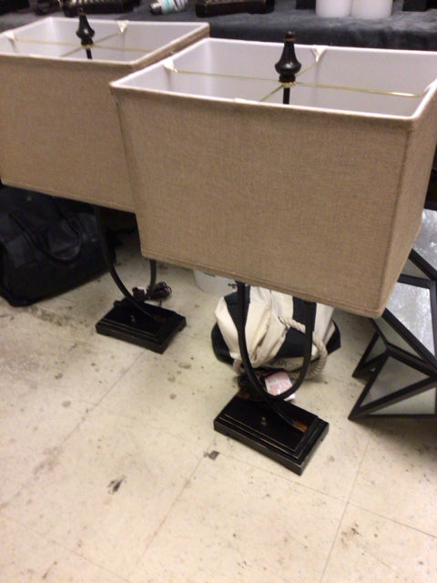 Pair Of Metal Double Light Table Lamps W/Rectangle Shades