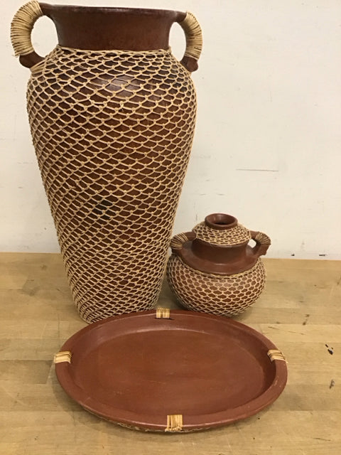 Set Of 3 Pottery W/Rattan Mesh Made In Isreal